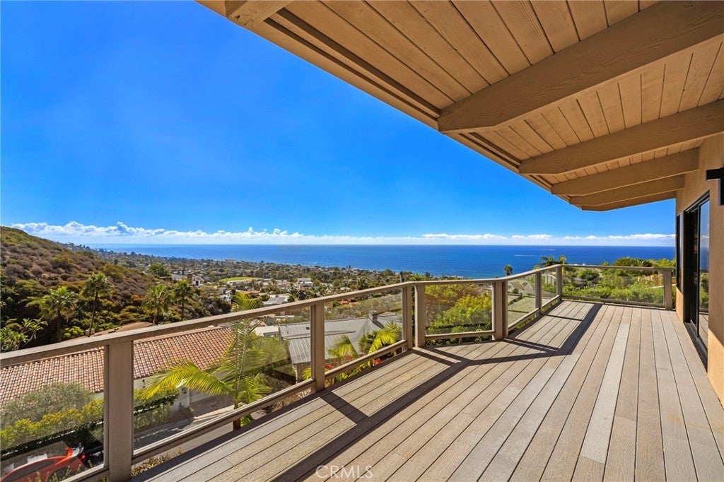 Experience the ultimate coastal lifestyle in this very special single-level home, ideally situated on a quiet, single-loaded street in the prestigious Mystic Hills neighborhood of Laguna Beach. This contemporary residence showcases sweeping ocean views from the living and dining areas as well as the primary bedroom and has central air conditioning for year-round comfort. Designed with an open, modern layout, the great room features vaulted, wood-beamed ceilings, a cozy brick fireplace, and a dining area that flows seamlessly into the kitchen. The home has been freshly painted throughout and offers brand-new luxury vinyl plank flooring for a clean, coastal aesthetic. Step out onto the expansive deck that spans the entire length of the home -- perfect for entertaining or simply soaking in the breathtaking panoramic views. The property sits above a beautifully landscaped hillside filled with mature greenery, creating a private, garden-like setting for nature lovers. Located just minutes from Laguna’s charming downtown village, world-class beaches, art galleries, and award-winning restaurants, this home combines serene hillside living with easy access to everything that makes Laguna Beach so desirable.