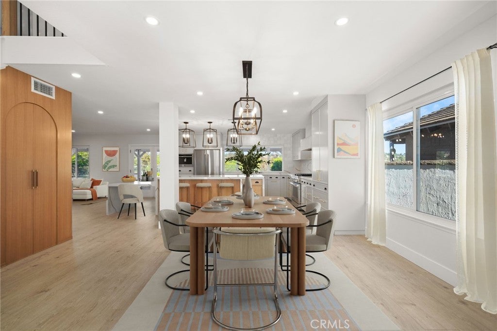Perched on a quiet street with no neighbors behind, this reimagined 4-bedroom, 3.5-bath home ($440K+ in permitted upgrades!) offers sun-soaked, open-concept living with soaring ceilings, luxury vinyl plank floors, recessed lighting, and sleek matte-black accents. The chef’s kitchen steals the show with a 13-foot quartz island, custom cabinetry, polished-brass hardware, a 36" professional 6-burner range, and a built-in JennAir coffee system—perfect for entertaining or everyday indulgence. Modern systems bring convenience and peace of mind, including updated electrical with USB-C/dimmers, smart thermostat, hardwired smoke/CO alarms, exterior camera, and a smart doorbell. Step through double wood doors to a beautiful staircase with LED wall lighting. The primary retreat is a private, view-rich sanctuary, while a rare secondary ensuite provides flexibility for guests or home office use. The exterior dazzles with Spanish-tile curb appeal, certified roof, manicured landscaping, and a 3-car garage. Backing to open space and the Oso Creek Trail, the backyard—framed by white rose bushes—offers room for a pool, spa, or outdoor kitchen. Located just minutes from shopping, dining, the Aquatics Complex, and Tennis Pavilion, this home combines style, function, and unforgettable mountain and city-light views—a Mission Viejo gem you don’t want to miss!