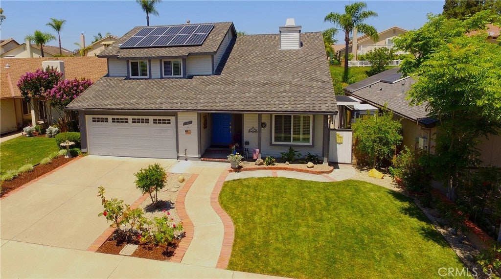 Experience a true Mission Viejo treasure. Highly upgraded Montiel home with fully-owned solar and Lake Mission Viejo amenities. The bright and cheerful entry welcomes you to a beautiful living room highlighted by a romantic fireplace. Four spacious bedrooms and two-and-a-half baths in approximately 1996 sqft. Fabulous kitchen with granite counters, commercial grade Viking stove & refrigerator, Bosch dishwasher, and pleasant breakfast bar. The kitchen is open to a warm and inviting family room. Sunny dining room includes a built-in Sub-Zero wine captain with dual temperature control for reds and whites, Classy bamboo flooring, recessed lighting in all bedrooms, and an attic exhaust fan, Cleverly designed additional storage under the stairs, in the primary bedroom, and in a secondary bedroom. The home was recently re-piped and has a 50 gallon hot water heater with recirculation pump. You will love the amazing, large, private back yard retreat including a spacious patio, multiple seating areas, 13 mature fruit trees, 2 grape vines, and raised flower beds with roses, all on a drip watering system. Plus there is an added greenhouse/potting shed, and a storage shed. An HOA maintained greenbelt at the rear of the property adds to the privacy and serenity of the back yard. Beautiful Crucero Park is just around the corner. Lake Mission Viejo and Oso Creek Golf Course are just down the road. Additionally, very nearby are extensive shopping, dining, Marguerite Recreation Center, YMCA, and Nadadores swim facility. Outstanding Saddleback Valley Unified schools. Low property tax rate and no Mello-Roos assessment. This home can be your forever paradise . . .welcome home !!!
