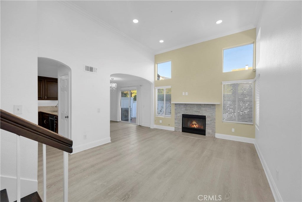 his beautifully upgraded end-unit townhome with an enclosed yard is the perfect place to call home. Step inside to discover dramatic high ceilings, abundant natural light, and an open floor plan designed for modern living. The inviting living room features an upgraded fireplace and flows seamlessly into the dining area and a stunning kitchen with granite counters, a breakfast bar, upgraded cabinetry, stainless steel appliances, recessed lighting, and a spacious walk-in pantry.